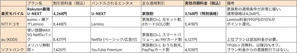 各社のデータ無制限・エンタメバンドルプランを、単身契約で各種割引を最大限適用した場合の実効料金で比較してみましょう。
