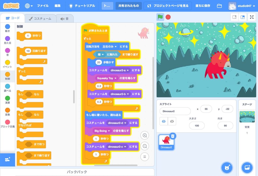 きっかけは、部活で触れた「Scratch」でした。 それは、かつて僕を絶望させた、あの分厚い本に並ぶ呪文のようなコードとは全くの別物。まるでパズルのように、色のついたブロックをマウスでドラッグ&ドロップして組み合わせるだけで、画面の中のキャラクターが思い通りに動くのです。